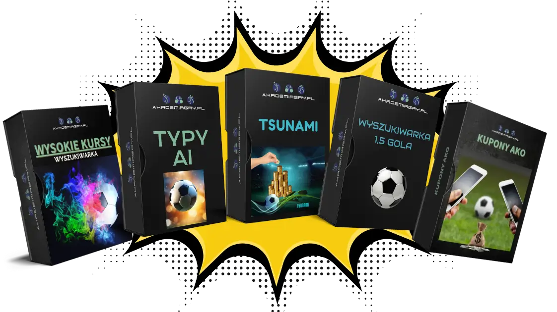 Dostępne wyszukiwarki (pełna lista na www.programyakademiagry.pl): Tsunami, 1,5 gola, BTTS, Kupony AKO, Typy AI, Wysokie Kursy, 2,5 gola, Tenis, Super Info, Remisy, Live, Koszykówka.